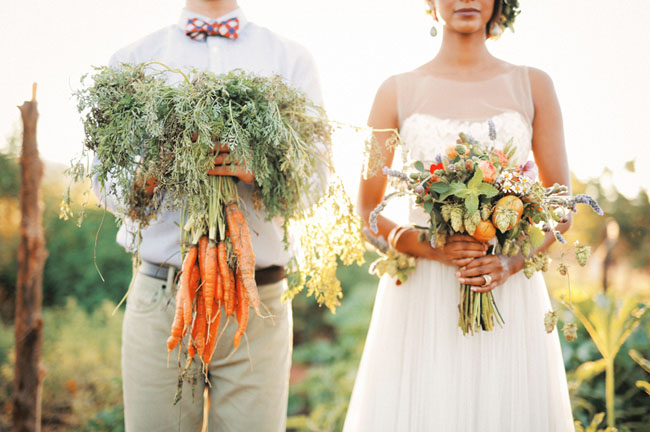 Букет невесты и бутоньерка жениха – те аксессуары, в которых овощи могут не только дополнять, но и заменять цветы! Если вы во всем ищете золотую середину, выбирайте букет растрепанной формы и разбавляйте цветы наиболее привлекательными овощами — артишоками, декоративной капустой, сладким перцем. А если вы за креативный подход, составляйте «букет» из охапки овощей с роскошной ботвой!